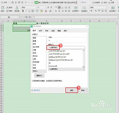 在自定义界面,选择类型【G/通用格式】,在类型前添加符号【-】,点击【确定】即可。