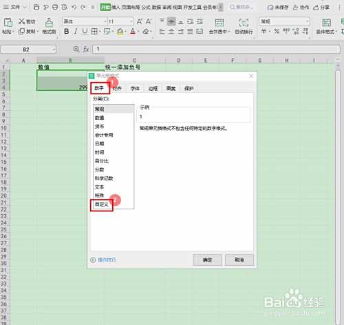 在单元格格式界面,点击选择【数字】→【自定义】;