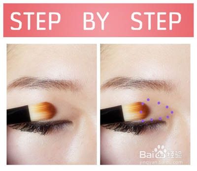 用刷子蘸取少量淡裸色眼影,快速的刷满整个眼窝上。将眼影正中间的亮色高光从眼角开始涂到中央,记住只在眼角一侧哦!