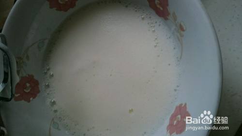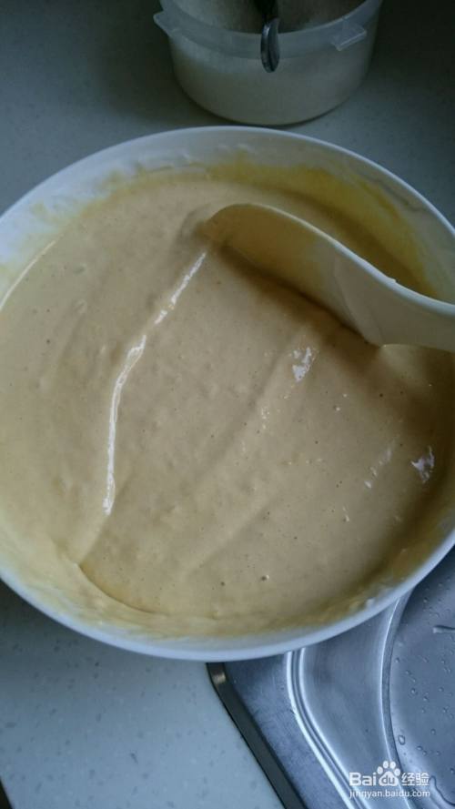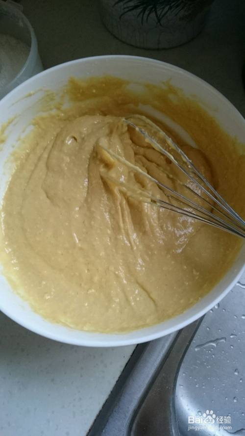 准备两个无水无油的汤碗,把蛋清蛋黄分开装。这里教大家一个分蛋清的好方法,如果你是新手,拿鸡蛋的一头放在尖的物品上面敲一个小洞,把洞剥开至小孩子的小拇指大小,蛋清就流出来了,蛋黄就留在蛋壳里,等蛋清流完了,再把蛋壳洞开大点,把蛋黄放另一个碗里。(不要买什么蛋清分离器,一点都不好用)蛋黄碗加入面粉.泡打粉.两勺糖.一勺椰蓉,一点点添加牛奶,搅拌至浓稠的糊状,面粉要搅到无颗粒为止。