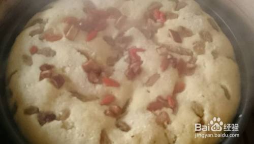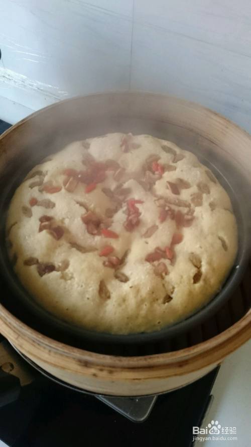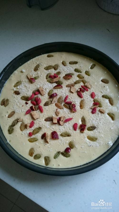 容器擦干水分,表面涂一层油,倒入面糊,上面撒上椰蓉.葡萄干.红枣丁及少于枸杞装饰一下就可以上锅蒸了。水烧开后放入,蒸15分钟左右就可以了,开盖后用筷子插入,筷子上不沾面糊就熟了。(做好的面糊也可以放入电饭锅里烤,但是时间会比蒸的时间长)