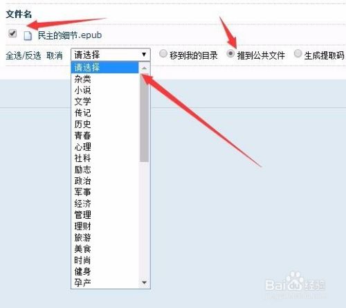 上传完之后,选择你要分享的书,然后点击推到公共文件,在选择分类就可以了