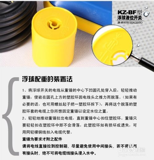 1.将浮球开关的电线从重锤的中心下凹圆孔处穿入后,轻轻推动重锤,使嵌在圆孔上方的塑胶环因电线头之推力而脱落。(如果有必要的话,也可用螺丝起子把一塑胶环拆下),再将这个脱落的塑胶环套的电缆上你所想因定重锤以设定水位之置。