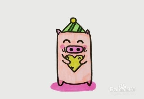 画一个长方形身体,画出猪鼻子,画两只手抱着一个爱心,再头顶画上三角形的帽子,把小猪身体涂粉色,爱心和圆球涂黄色,接着猪鼻子和脸蛋涂玫红色,帽子涂上绿色,猪脚和脚下涂上玫红色,一只快乐的小猪就画好了。