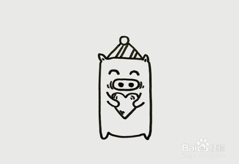头顶画上三角形的帽子,上面画一个圆球,里面画上一些斜线作为花纹,猪鼻子周围和爱心上也画一些线条作为褶皱。
