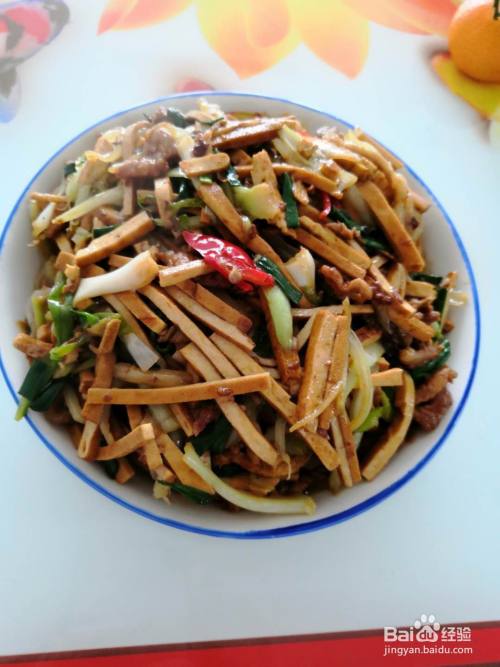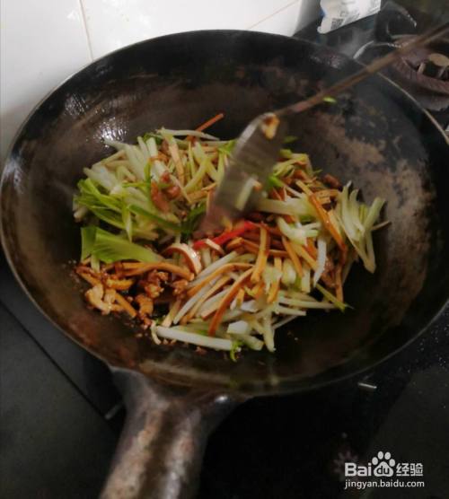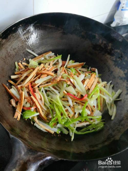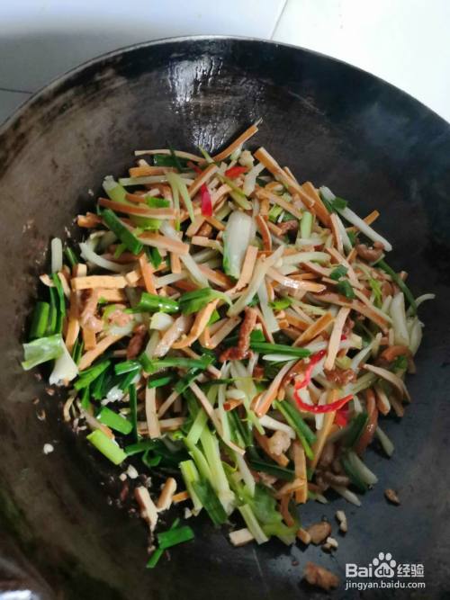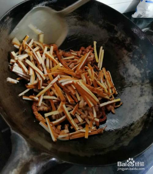 热锅冷油下入肉丝翻炒,接着放入香干继续中大火翻炒;
