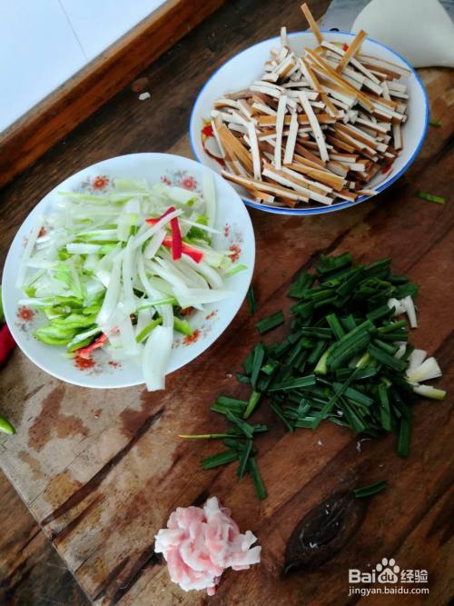 先准备食材,小白菜取用菜杆子,叶子不要可以做别的用途,豆干、猪肉切条状(加点淀粉和盐抓匀腌制一会),韭菜,香葱切段备用;