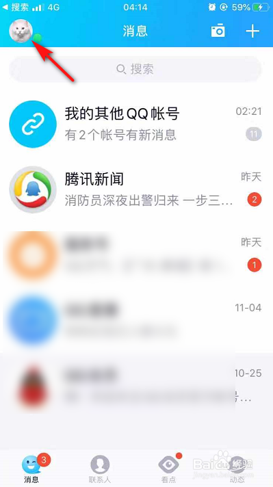 1、首先,点击打开手机QQ,进入QQ主界面,点击左上角的小头像图标