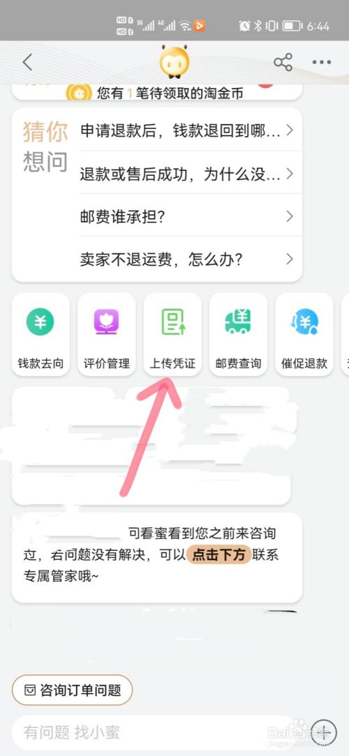 进入“查看详情后”,就自动进入淘宝客服页面,之后选择“上传凭证”,讲订单证据一一上传,并跟客服说明诉求,这样淘宝小二就自动介入处理了。如图。