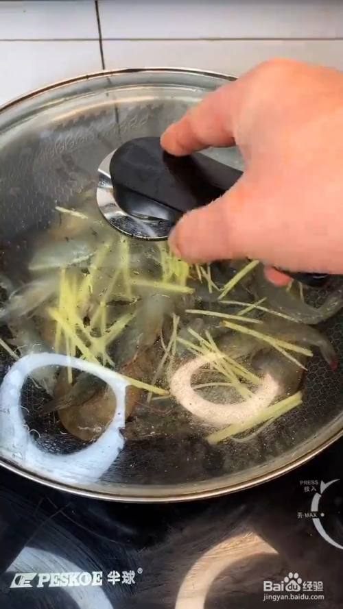 首先大虾放进锅中,加入酒姜丝盐,蒸五六分钟