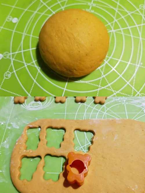 2将面团取出揉圆,擀成0.5cm厚的长方形,用喜欢的模具压出形状,边角料揉圆再擀平压模
