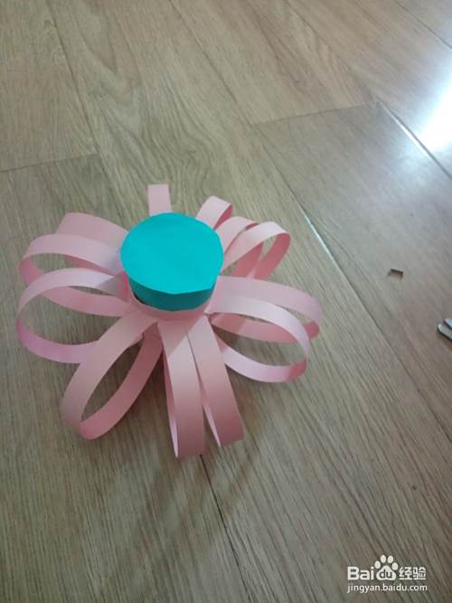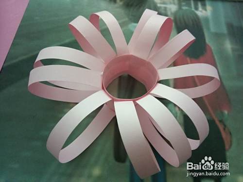 将剪开的长条分别往上折粘在上面一排折痕上。长条粘完后将纸边往内合成一个圆形,用胶水将其贴合好。如图所示。