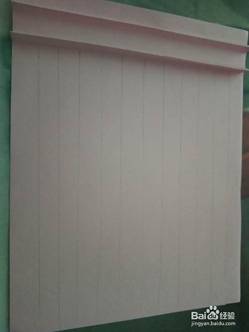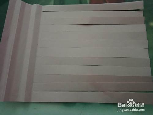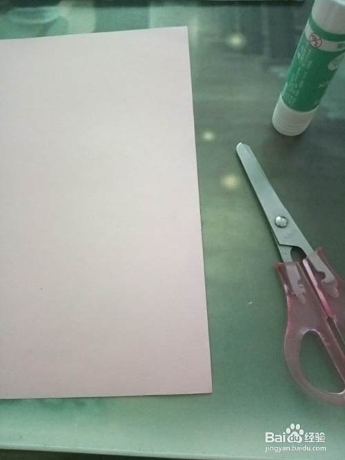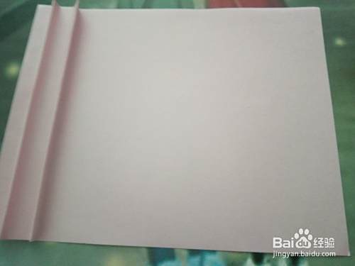 准备好工 具,将粉色长方形卡纸上面折两段,如图所示。
