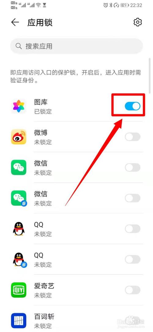 在弹出的页面中勾选需要设置密码的应用右侧按钮即可。
