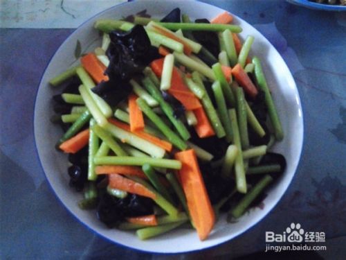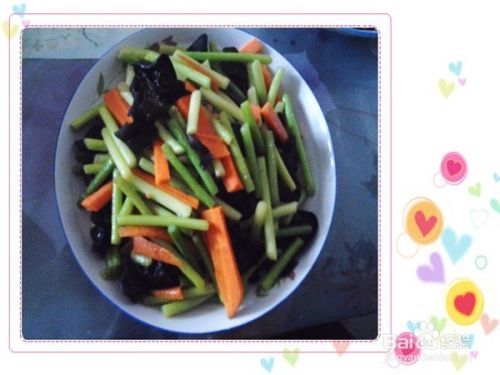 装盘,一盘色味俱佳的黑木耳蒜苔红萝卜菜就做好了。