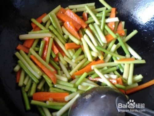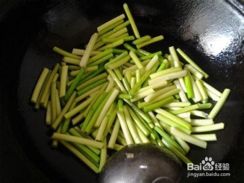 烧热炒锅倒入适量的植物油,烧至6成热时,倒入蒜苔翻炒一会。