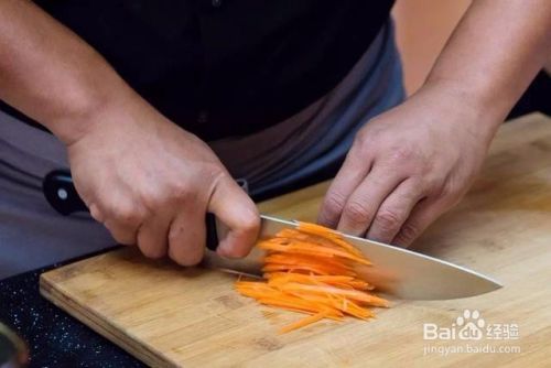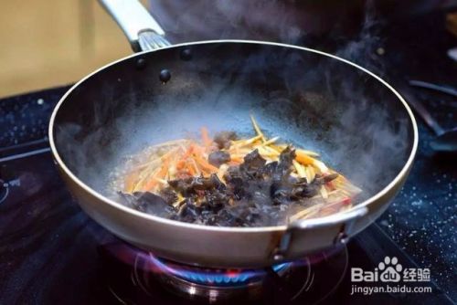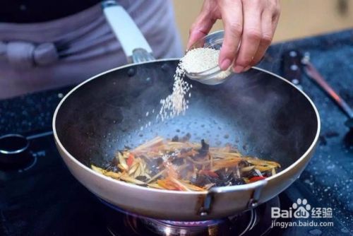 将适量的芝麻油放入锅中,再依次放入胡萝卜丝、牛蒡丝、红辣椒、糖、酱油、水翻炒。