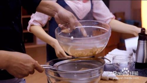 将适量热水倒入装柴鱼片的碗中,然后过滤掉柴鱼片。