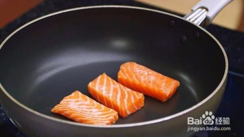 将腌好的三文鱼放入锅中干煎,煎至变色即可装盘备用。