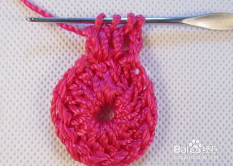 在5短针上钩7针松叶针的花瓣,第二层花瓣14个