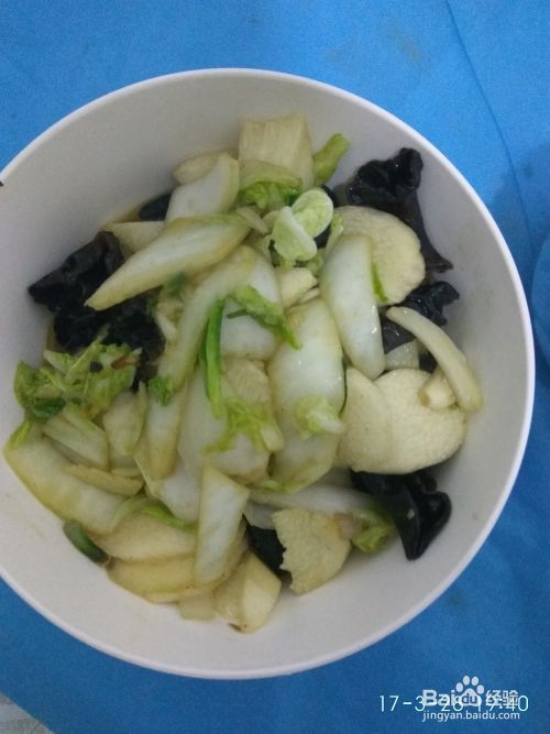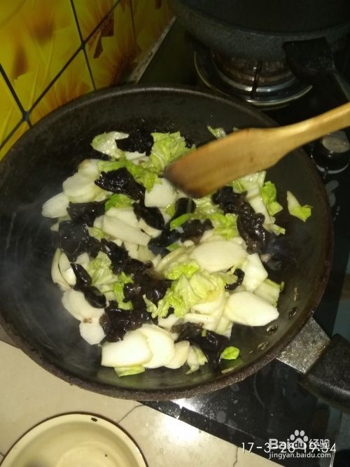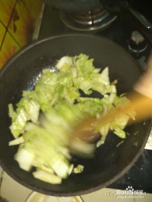 起油锅,放白菜,注意火大一些,不要让白菜粘锅,多拌炒,放入食盐适量等必要调料,至白菜干七分熟