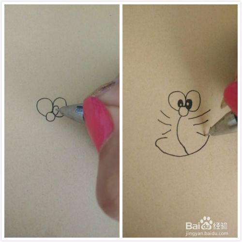 先要画出多啦A梦的眼睛,定好位置后,画出嘴巴和周围的胡须。