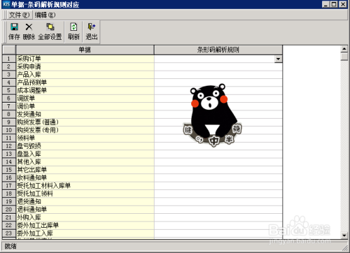 10、点击明细功能“49052条形码关联”之后——出现窗口“单据-条码解析规则对应”,在此窗口需要进行以下步骤的操作: