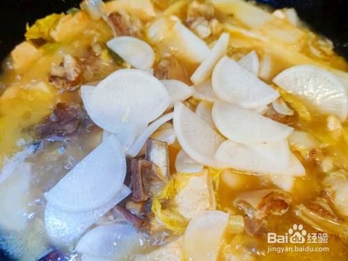 将入味的羊肉倒入锅中和豆腐,娃娃菜一起炖10分钟,要改成小火
