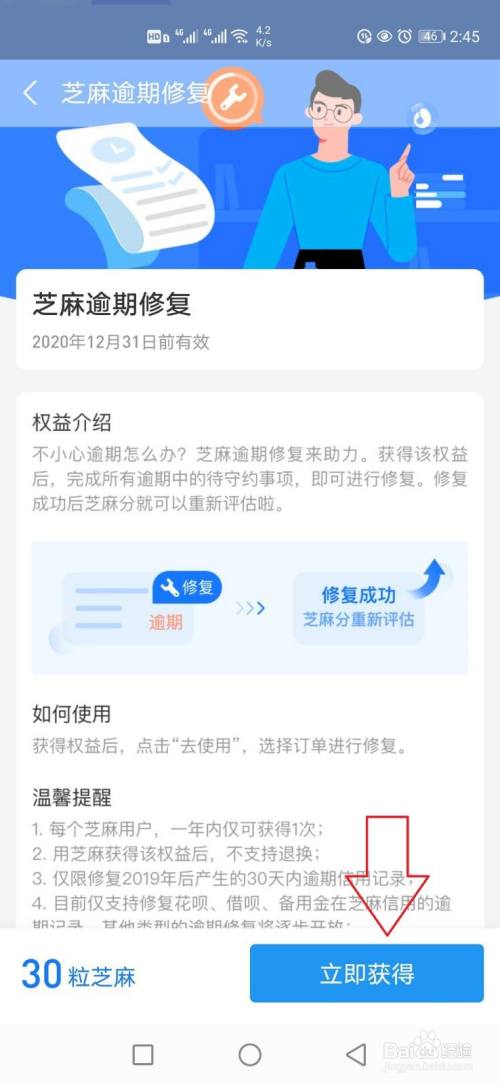 6.点击【立即获得】,会扣除【30信用粒】,可以消除最近30天的【逾期信用】。
