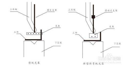 折弯机保护装置主要是在折弯机上模模尖附近设定保护区域,在上模下方2-3mm处形成激光保护区域。在折弯机使用过程中,折弯机保护装置的发光器和受光器能够随着上模的移动而移动,始终和上模保持2-3mm。