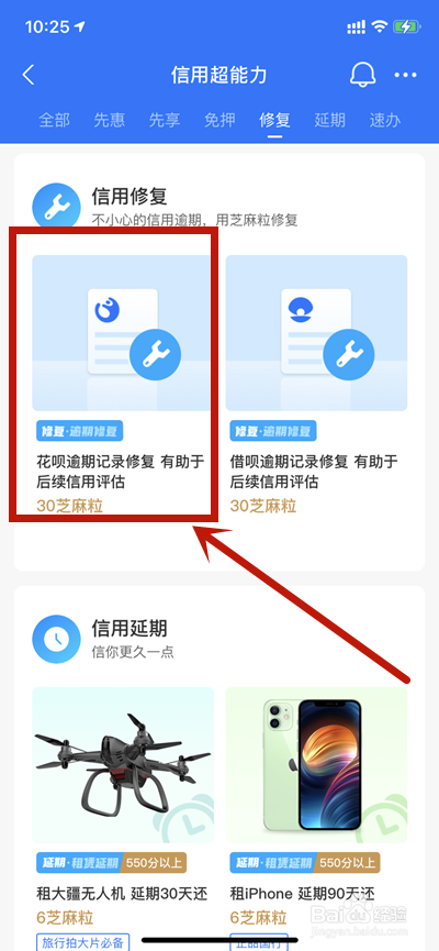 进入芝麻分修复的页面后,再点击花呗逾期修复即可。