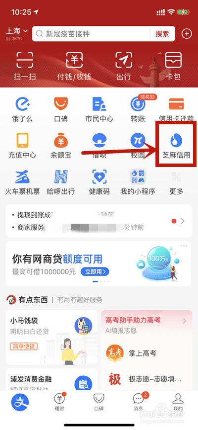 打开手机支付宝,在主页面找到芝麻信用点击进去。