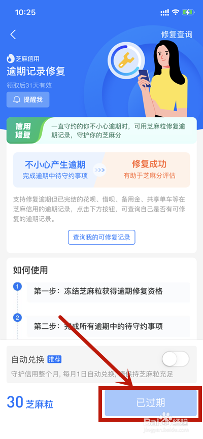 使用30芝麻粒来兑换逾期修复卡,注意兑换完之后要立即用掉,不然月底会清掉。