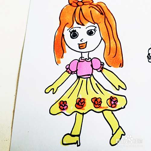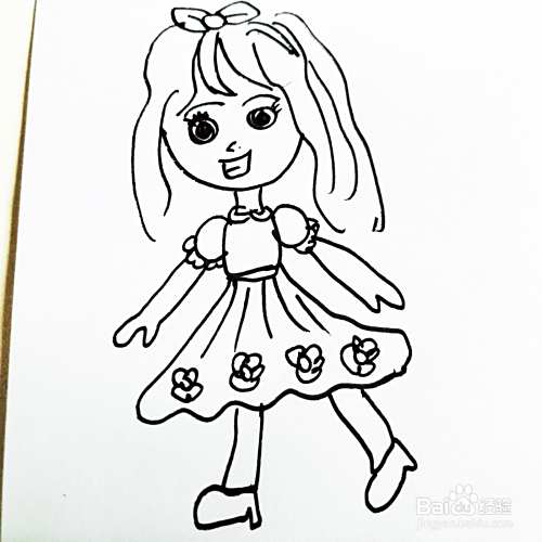 第六步,我们来画卡通公主的裙子上面的细节线条和花朵。