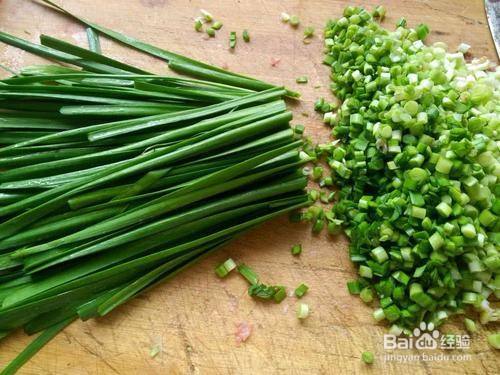 把新鲜的韭菜摘好,洗净,沥干水后,切成大小均匀的韭菜丁