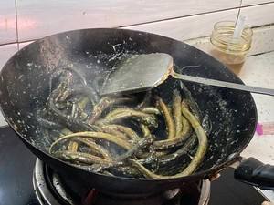 油热以后,倒入活黄鳝盖上盖子大火煎起,(胆儿小的慎入),直至所有的黄鳝不会跳出来以后揭开锅盖翻炒。