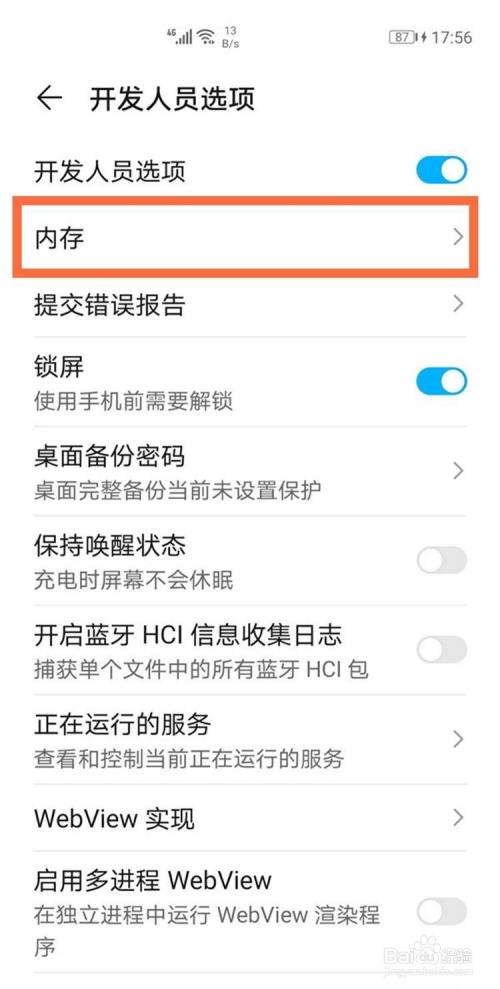2、进入开发人员选项,点击【内存】即可查看内存使用情况。