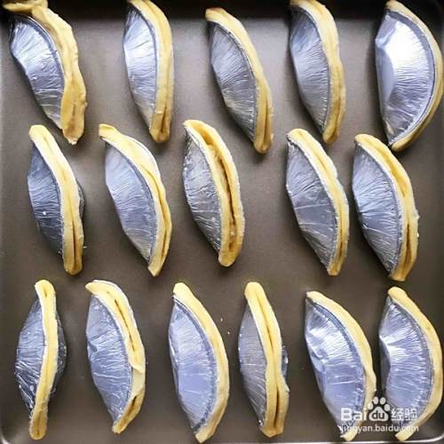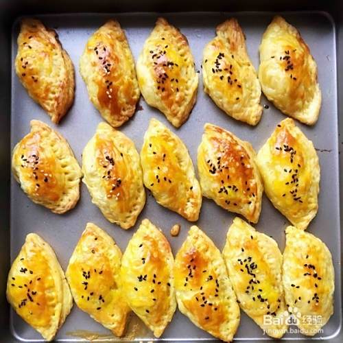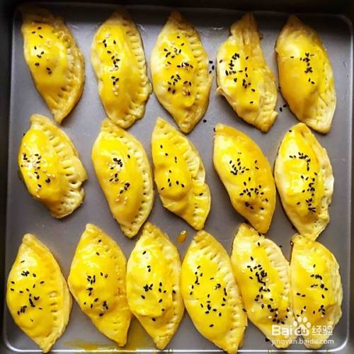 放进预热好的烤箱,中层,上下火,200度,十分钟后取出,去掉锡纸皮,用叉子把边压紧,刷上一层蛋黄,撒上芝麻