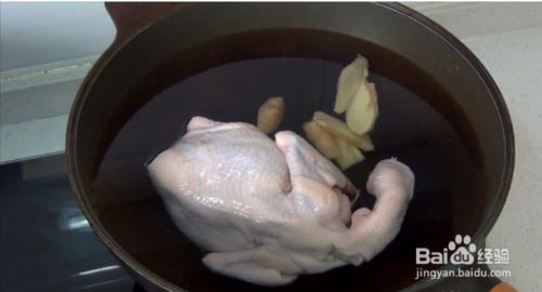 锅内加入大量清水,凉水下入整只鸡能更好焯出血水,再加入几片生姜能更好去腥,接着开大火煮开。水开后焯水5分钟,充分焯出血水,焯水完成后控水捞到温水中,用温水清洗干净。