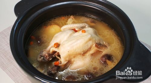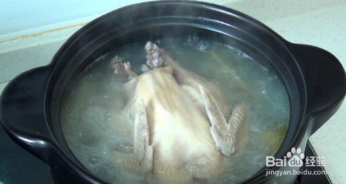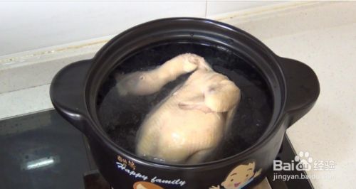 接着更换一口砂锅,把整只鸡放入砂锅内,再加入大量热水,砂锅加温更均匀,炖出的汤也会更好喝,大火煮开后转小火,盖上盖子炖1小时。