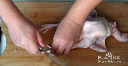 鸡肉买回来后需要处理干净,鸡脖子处有淋巴,需要去除干净,鸡肚内容易有杂质也要清除干净,用刀把鸡脚趾剁去,然后把整只鸡清洗干净。