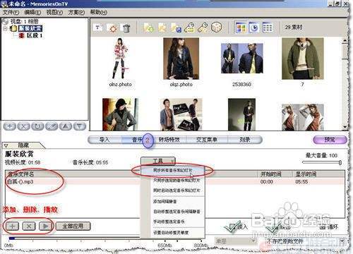 如果对于导入的音乐感觉太舒缓,或者前奏太长,可以点击添加背景音乐按钮旁边的“工具”按钮,在弹出菜单中选择“手工修整选定音乐”命令,如图5所示。
