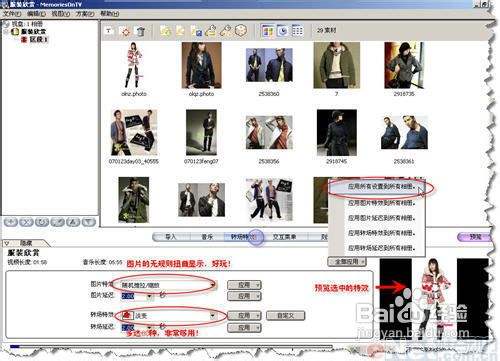 在这里设计幻灯片播放时的特效,有图片、转场两个方面。图片上有“随机放大”、“随机推拉”、“随机缩小”、“随机旋转”等;转场上有“淡变”、“折叠”、“百页窗”、“膨胀”、“五彩纸屑”、“蹦跳立方体”、“旋转”、“烟雾”等58种,可以任意挑选。而且两者都赋予时间延迟,按秒为单位,可以定义数值。在右边的窗口中可以实时的观看到特效效果,非常的方便!当所有的设置都弄好后,点击 “全部应用”,在弹出的菜单中选择“应用所有设置到所有相册”或“应用图片特效到所有相册”等命令,这要根据大家的所要实现的目标来确定。如图3所示。