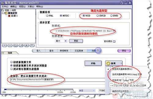 在一部分中,首先会自动识别已经安装好的的刻录机,确定要刻录的光盘类型,视频格式、映像文件存放目录,是否生成MPEG文件等。如图7所示,总之刻录操作不借助任何第三方软件便可轻松搞定。制作成的电影文件就可以通过电脑上的媒体播放器来播放,也可以拿到VCD/SVCD/DVD机上播放了。如图6所示: