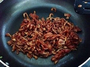 步骤7中煸好的肉丝倒回锅中翻炒均匀,加入剩余的生抽爆香关火,装盘