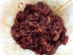 用料酒、老抽、蚝油把肉丝拌匀,腌20分钟