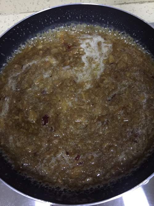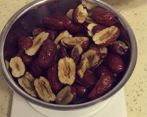 2取一砂锅,放水没过红枣,小火煲至锅内没水,呈干状,这步大概小火煲了50分钟,这时的红枣非常粘且软。关火后稍放凉取一勺子把红枣肉压成泥状(不爱吃皮可在这步去皮)。