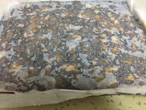 6不粘盘放不粘纸,倒入,在上面再贴一张不粘纸,压平。