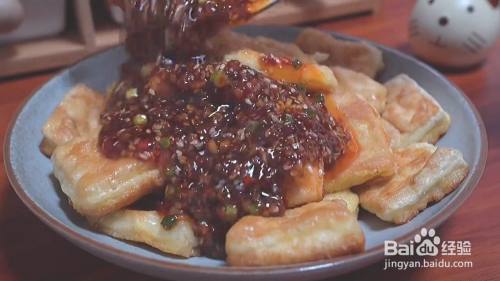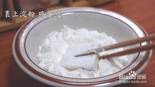 豆腐切块。裹上淀粉和鸡蛋液,放到油锅里煎至两面金黄