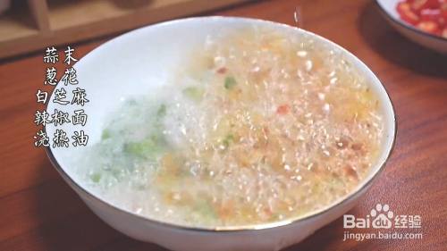 容器中放入蒜末,葱花,白芝麻,辣椒面。浇上热油。再放入生抽,醋,盐和糖,搅拌均匀